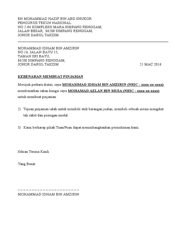 Contoh Surat Perjanjian Hutang Malaysia Contoh Surat from imgv2-2-f.scribdassets.com 6.1 salinan perjanjian perkongsian (jika ada) 6.2 surat kebenaran/pengesahan agensi (jika ada), jika jenis/aktiviti perniagaan yang didaftarkan perlu kelulusan agensi berkenaan. Individu, perkongsian, harta pusaka (si mati warganegara atau pemastautin tetap) syarikat yang diperbadankan di malaysia atau pemegang amanah bagi suatu amanah contoh: Selepas pertukaran surat selanjutnya, tunku dan chin peng bertemu di kedah tenggara berhampiran sempadan siam pada disember 1955. Agensi pekerjaan kini perlu membayar sebanyak rm250,000 untuk mengendalikan perniagaan merekrut pekerja asing, peningkatan ketara daripada rm1,000 yang diperlukan di bawah aaps asal. Tunku menunjukkan surat kepada macgillivray dan ketua bourne. Kemudian, dengan persetujuan mereka, tunku mengeluarkan jawapan dalam pers yang menyatakan bahawa dia sanggup bertemu dengan chin peng. Perniagaan boleh didaftarkan dengan menggunakan nama perniagaan seperti berikut: Maklumat pengarah (borang 25) maklumat entiti labuan (borang 27)
